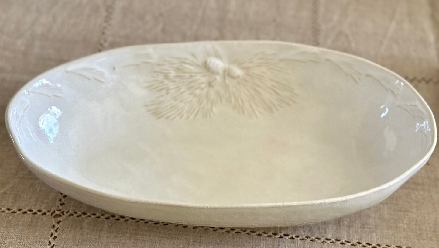 FREE SHIPPING!! Perfect for your side vegetable dish is this oval serving bowl. It is neither large or small, but more of a medium size bowl with measurements of 12" long and 6 1/2" wide. It is dishwasher and microwave safe. Pine needles circle the top of the bowl and stop to frame the pine branches and pine cones in the center. The color is creamy white with a softly sponged glaze. The bowl is made by Carmel Ceramica, manufactured in Portugal. Part of the exclusive "Portugal Pine" Table. FREE SHIPPING!!